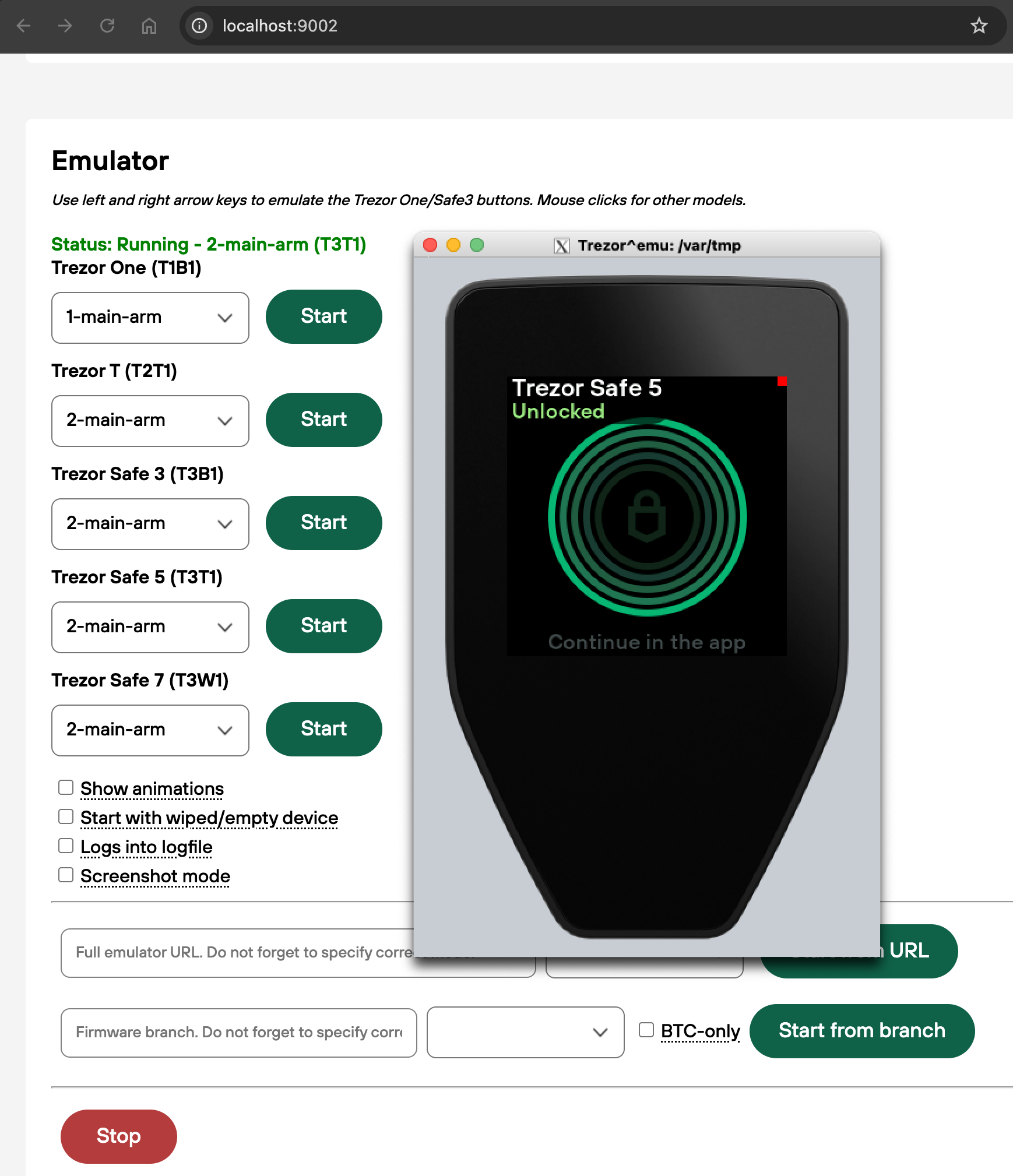 ./run.sh- it will determine your platform and launch trezor-user-env. See./run.sh --helpfor some additional arguments. - Open http://localhost:9002.